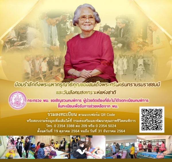 ประชาสัมพันธ์ เชิญชวนคนพิการ ผู้ป่วยติดเตียงที่ยังไม่ได้จดทะเบียนคนพิการขึ้นทะเบียนเพื่อขอรับความช่วยเหลือจาก พม. โดยสามารถขึ้นทะเบียนเพื่อขอรับการช่วยเหลือ ตั้งแต่ วันที่ 19 ตุลาคม ถึง 31 ธันวาคม 2564 ตามแบบฟอร์ม QR Code ที่แนบมาพร้อมนี้