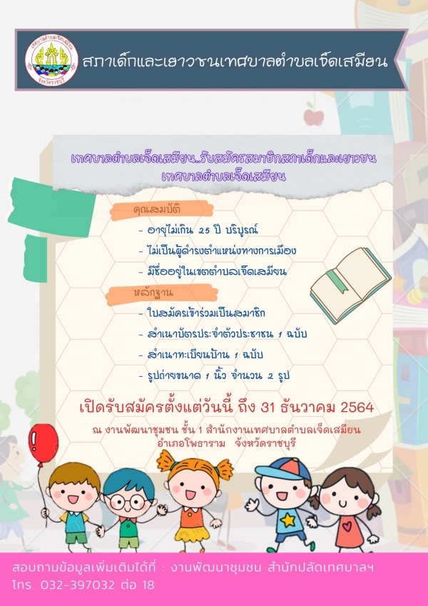 ประกาศ รับสมัครเด็กและเยาวชนเพื่อเข้ารับการคัดเลือกเป็นสมาชิกสภาเด็กและเยาวชนเทศบาลตำบลเจ็ดเสมียน ประจำปี 2565 โดยมีรายละเอียดดังนี้