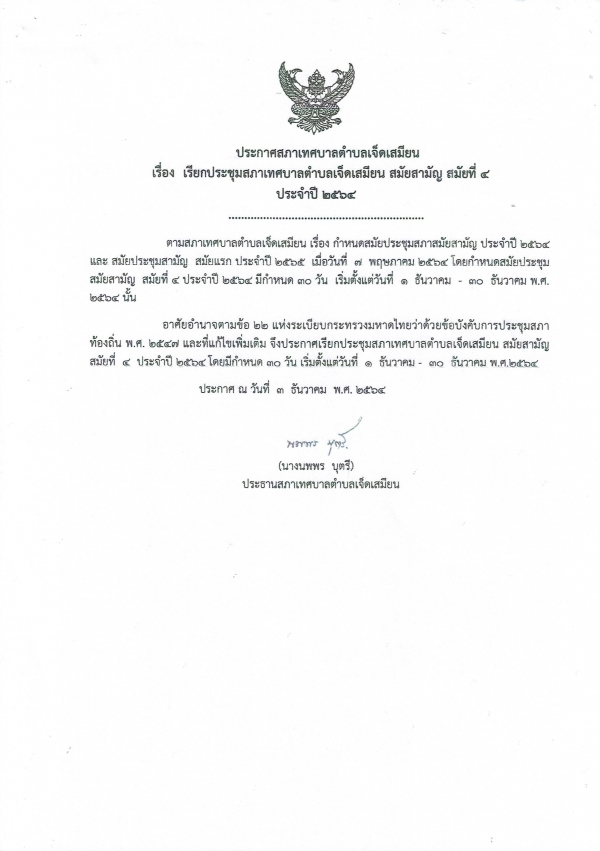 เรียกประชุมสภาเทศบาลตำบลเจ็ดเสมียน สมัยสามัญ สมัยที่4 ประจำปี 2564