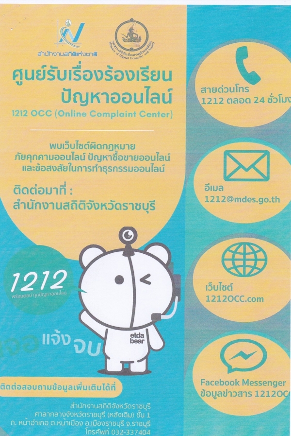 เทศบาลตำบลเจ็ดเสมียนของประชาสัมพันธ์ช่องทางการให้ความช่วยเหลือประชาชนจากปัญหาออนไลน์ผ่านศูนย์รับเรื่องร้องเรียนปัญหาออนไลน์ (Online Complaint Center) หรือ 1212 OCC ให้กับประชาชนในพื้นที่ได้ทราบอย่างทั่วถึง จึงของแจ้งช่องทางการร้องเรียนขอความช่วยเหลือจากศูนย์ฯผ่านช่องทาง ทางสายด่วน 1212 ตลอด 24 ชั่วโมง อีเมล์ 1212@gmail.com เว็ปไซค์ 1212 OCC Facebook Messenger ข้อมูลข่าวสาร 1212 OCC