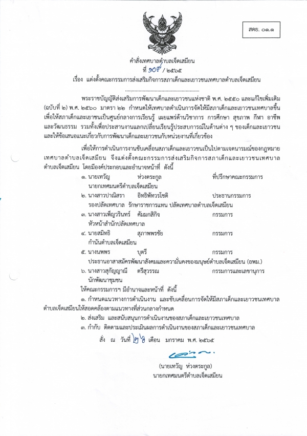 คำสั่งแต่งตั้งคณะกรรมการส่งเสริมกิจการสภาเด็กและเยาวชนเทศบาลตำบลเจ็ดเสมียน