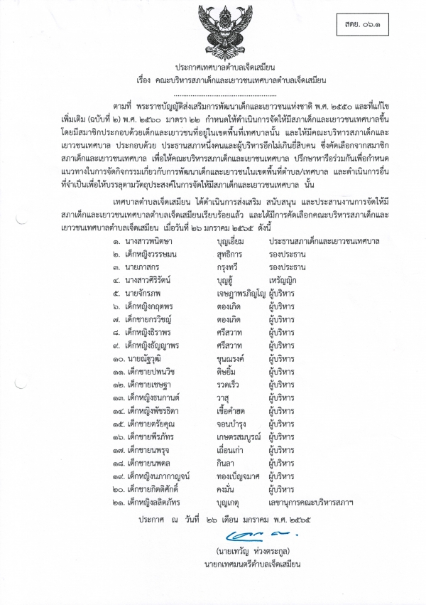 ประกาศเรื่อง คณะบริหารสภาเด็กและเยาวชนเทศบาลตำบลเจ็ดเสมียน