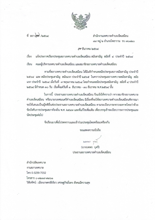 แจ้งประกาศเรียกประชุมสภาเทศบาลตำบลเจ็ดเสมียน สมัยสามัญ สมัยที่ 4 ประจำปี 2564