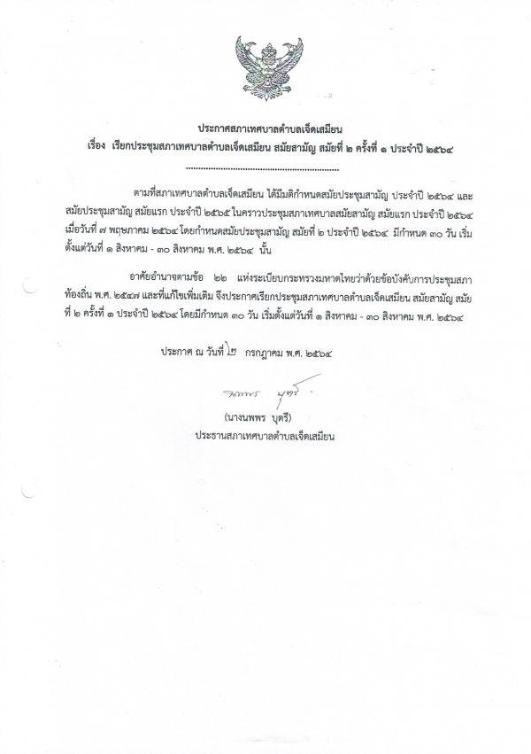 เรียกประชุมสภาเทศบาลตำบลเจ็ดเสมียน สมัยสามัญ สมัยที่ 2 ครั้งที่ 1ประจำปี 2564