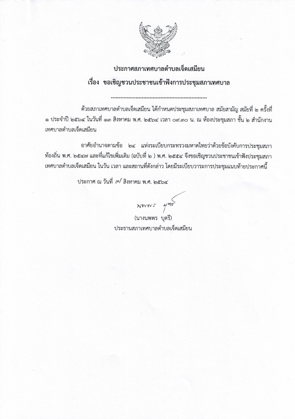ประกาศสภาเทศบาลตำบลเจ็ดเสมียน เรื่อง ขอเชิญชวนประชาชนรับฟังการประชุมสภาเทศบาล สมัยสามัญ สมัยที่ 2 ครั้งที่ 1 ประจำปี 2564