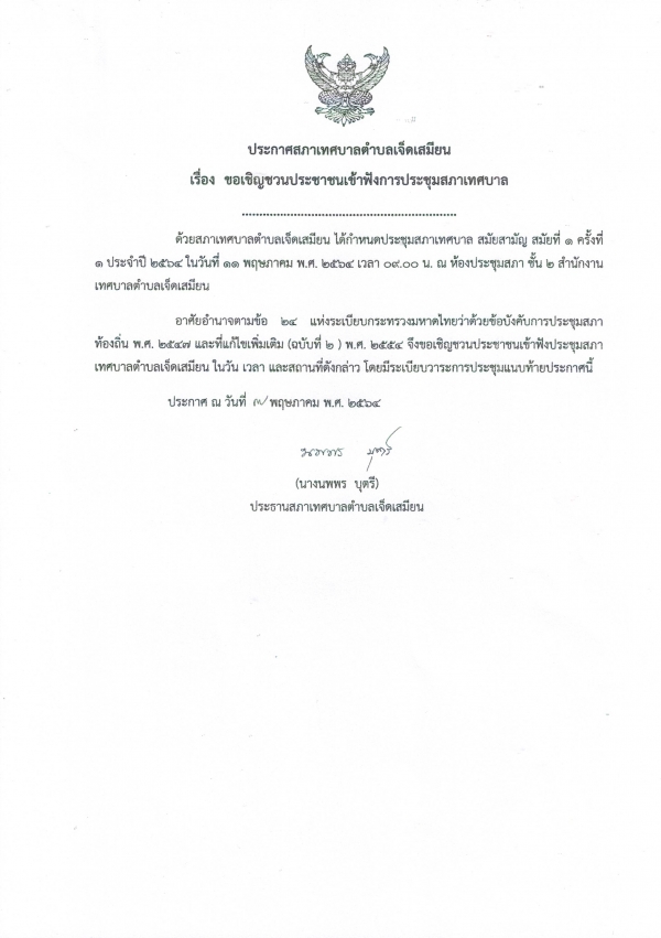 ประกาศสภาเทศบาลตำบลเจ็ดเสมียน เรื่อง ขอเชิญชวนประชาชนรับฟังการประชุมสภาเทศบาล สมัยสามัญ สมัยที่ 1 ครั้งที่ 1 ประจำปี 2564