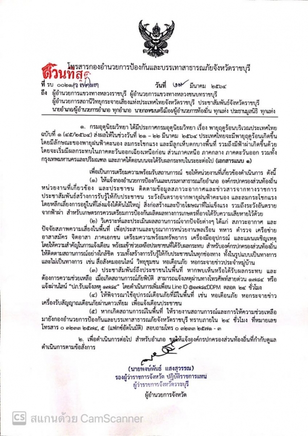 กรมอุตุวิทยา ได้มีประกาศกรมอุตุวิทยา เรื่องพายุฤดูร้อนบริเวณประเทศไทย ฉบับที่ ๑ (๔๕/๒๕๖๔) ส่งผลให้ในช่วงวันที่ ๒๑-๒๒ มีนาคม ๒๕๖๔ ประเทศไทยจะมีพายุฤดูร้อนเกิดขึ้นโดยมีลักษณะของพายุฝนฟ้าคะนอง ลมกระโชกแรง และมีลูกเห็บตกบางพื้นที่ รวมถึงมีฟ้าผ่าเกิดขึ้นด้วยโดยจะเริ่มมีผลกระทบในภาคตะวันตกเฉียงหนือก่อน ส่วนภาคเหนือ ภาคกลาง ภาคตะวันออก รวมทั้งกรุงเทพมหานครและปริมณฑล และภาคใต้ตอนบนจะได้รับผลกระทบในระยะต่อไป