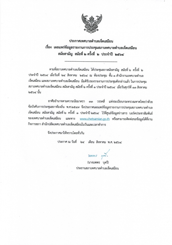 ประกาศเผยแพร่ข้อมูลรายงานการประชุม สมัยสามัญ สมัยที่ 2 ครั้งที่ 1 ประจำปี 2564
