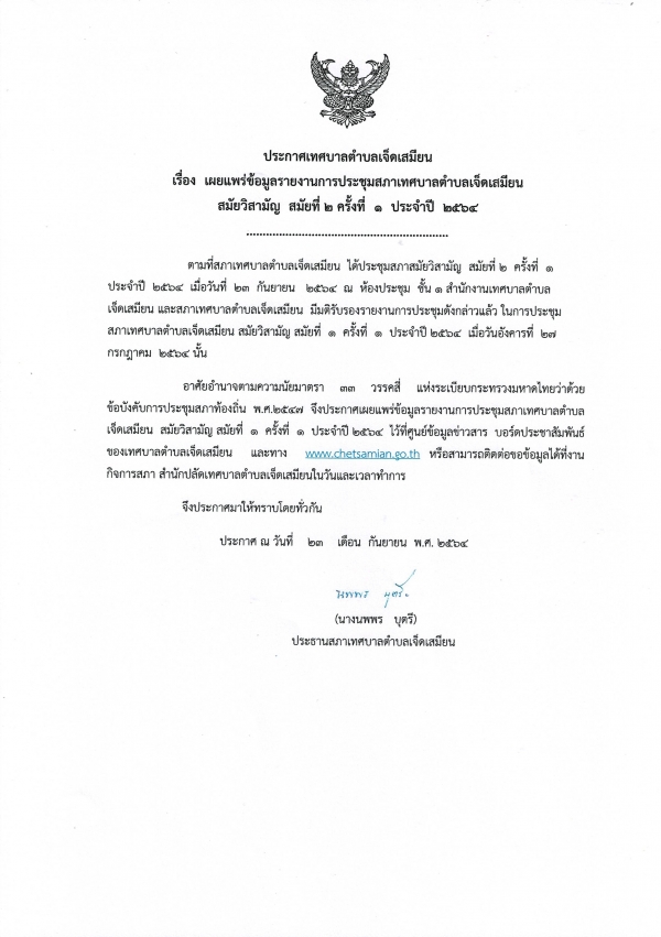 ประกาศเผยแพร่ข้อมูลรายงานการประชุม สมัยวิสามัญ สมัยที่ 1 ครั้งที่ 1 ประจำปี 2564