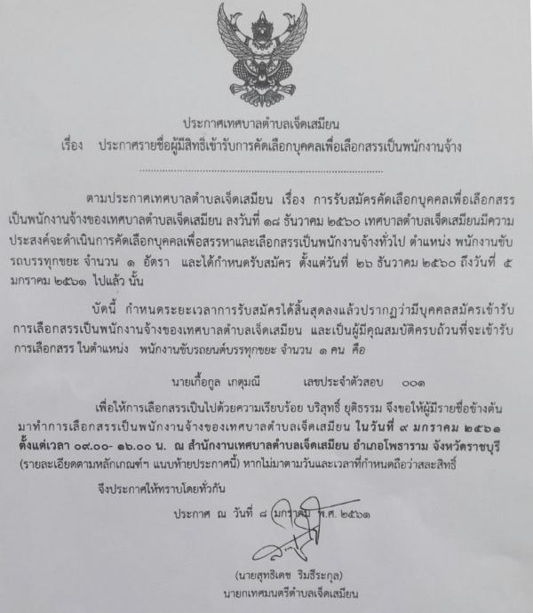 ประกาศรายชื่อผู้มีสิทธิ์เข้ารับการคัดเลือกเพื่อเลือกสรรเป็นพนักงานจ้าง