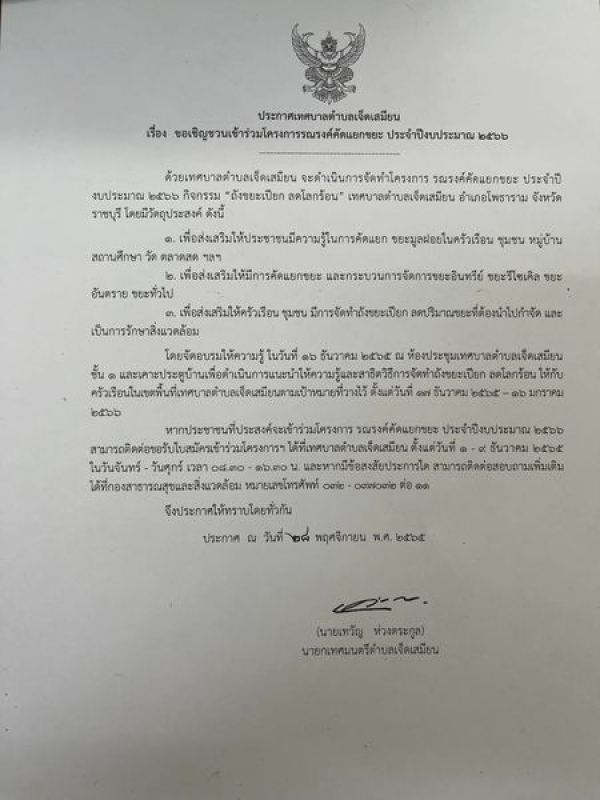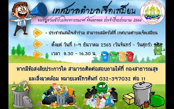 เทศบาลตำบลเจ็ดเสมียน ขอเชิญชวนผู้สนใจเข้าร่วมโครงการรณรงค์คัดเเยกขยะ ประจำปีงบประมาณ2566
