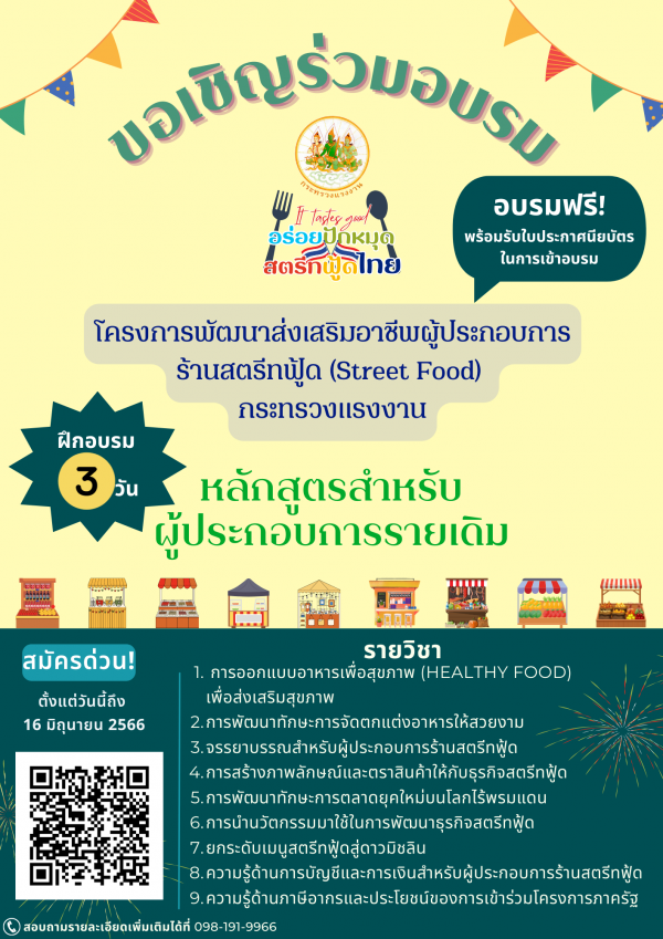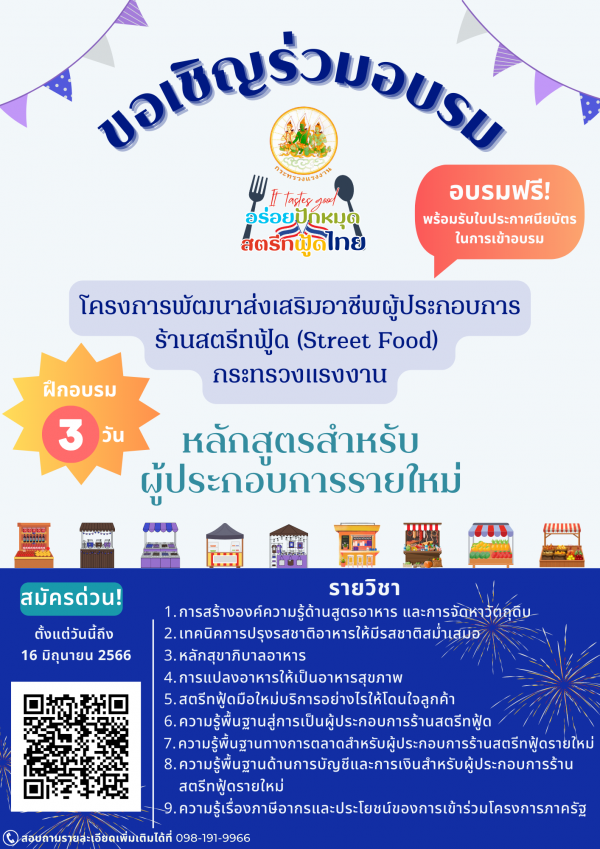 ประชาสัมพันธ์เชิญชวนผู้ว่างงานและผู้ประกอบการร้านสตรีทฟู้ด (Street Food) ลงทะเบียนเข้าร่วมฝึกอบรม