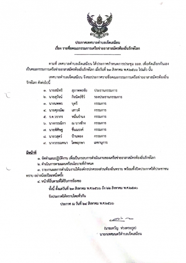 ประกาศรายชื่อคณะกรรมการเครือข่ายอาสาสมัครท้องถิ่นรักษ์โลก ปี2566