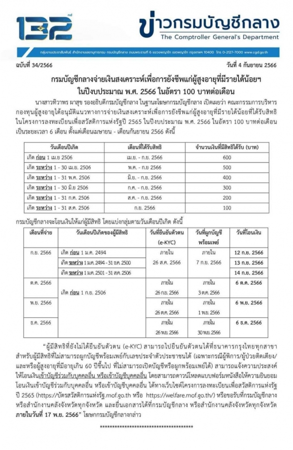 กรมบัญชีกลางจ่ายเงินสงเคราะห์เพื่อการยังชีพแก่ผู้สูงอายุที่มีรายได้น้อยฯในปีงบประมาณ พ.ศ.2566 ในอัตรา 100 บาทต่อเดือน