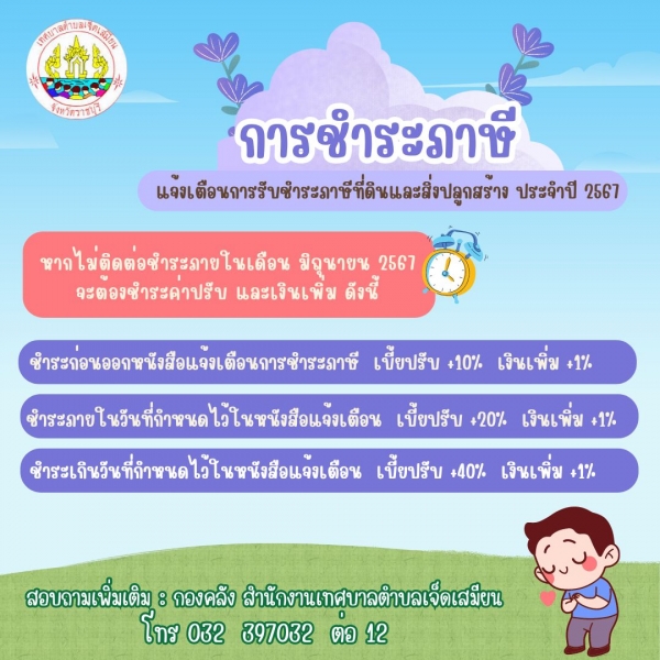 สอบถามข้อมูลเพิ่มเติม : กองคลัง เทศบาลตำบลเจ็ดเสมียน โทร 032 397032 ต่อ 12