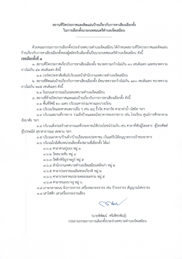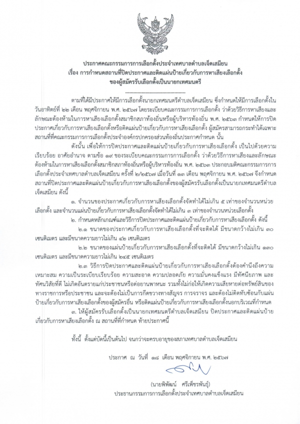 ประกาศคณะกรรมการการเลือกตั้งประจำเทศบาลตำบลเจ็ดเสมียน เรื่อง การกำหนดสถานที่ปิดประกาศและติดแผ่นป้ายเกี่ยวกับการหาเสียงเลือกตั้งของผู้สมัครรับเลือกตั้งเป็นนายกเทศมนตรี