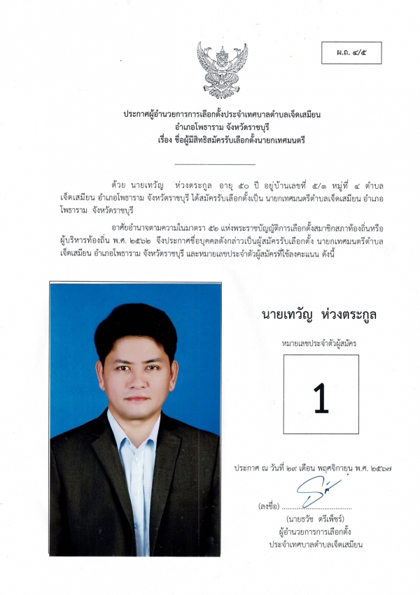 ประกาศผู้อำนวยการการเลือกตั้งประจำเทศบาลตำบลเจ็ดเสมียน อำเภอโพธาราม จังหวัดราชบุรี เรื่อง ชื่อผู้มีสิทธิสมัครรับเลือกตั้งนายกเทศมนตรี