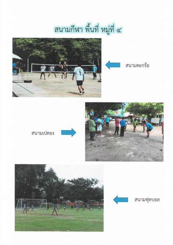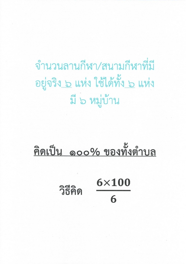 จำนวนลานกีฬา/สนามกีฬาที่มีอยู่จริง 6 แห่ง ใช้ได้จริงทั้ง 6 แห่ง มี 6 หมู่บ้าน