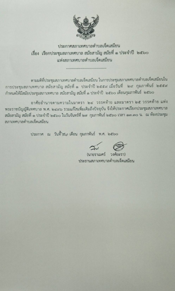 ด้วยประธานสภาเทศบาลตำบลเจ็ดเสมียน ได้เรียกประชุมสภาเทศบาลตำบลเจ็ดเสมียน สามัญสมัยที่ 1 ตั้งเเต่วันที่ 1 กุมภาพันธ์ 2560 เป็นต้นไป มีกำหนด 30 วัน เเละกำหนดประชุมสภาสมัยสามัญสมัยที่ 1 ครั้งที่ 1 ในวันที่ 27 กุมภาพันธ์ 2560 เวลา 13.30 น. ณ ห้องประชุมสภาเทศบาลตำบลเจ็ดเสมียน เพื่อกำหนดสมัยประชุมสภาเทศบาลตำบลเจ็ดเสมียน สมัยสามัญ ประจำปี 2560 เเละสมัยเเรกประจำปี 2561 ตลอดจนพิจารณาเห็นชอบจากสภาเทศบาลตำบลเจ็ดเสมียน ตามอำนาจหน้าที่ในเรื่องอื่นๆ ที่เกี่ยวข้อง ต่อไป