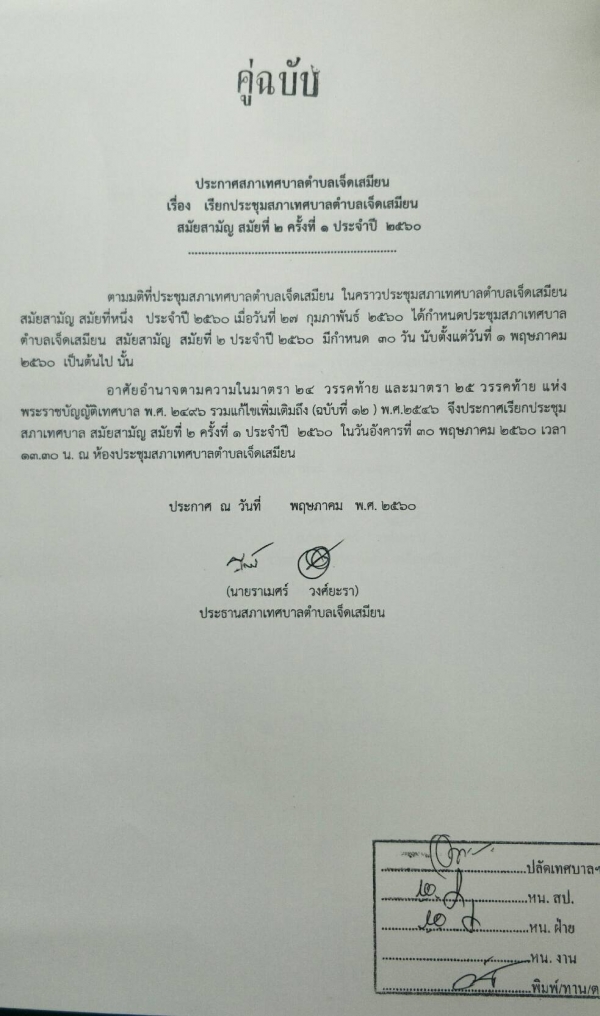 อาศัยอำนาจตามความในมาตรา 24 วรรคท้าย เเละมาตรา 25 วรรคเเรก เเห่งพระราชบัญญัติเทศบาล พ.ศ. 2496 รวมเเก้ไขเพิ่มเติมถึง (ฉบับที่ 12) พ.ศ. 2546 จึงประกาศเรียกประชุมสภาเทศบาล สมัยสามัญ สมัยที่ 2 ครั้งที่ 1 ประจำปี พ.ศ. 2560 ในวันอังคารที่ 30 พฤษภาคม 2560 เวลา 13.30 น. ณ ห้องประชุมสภาเทศบาลตำบลเจ็ดเสมียน