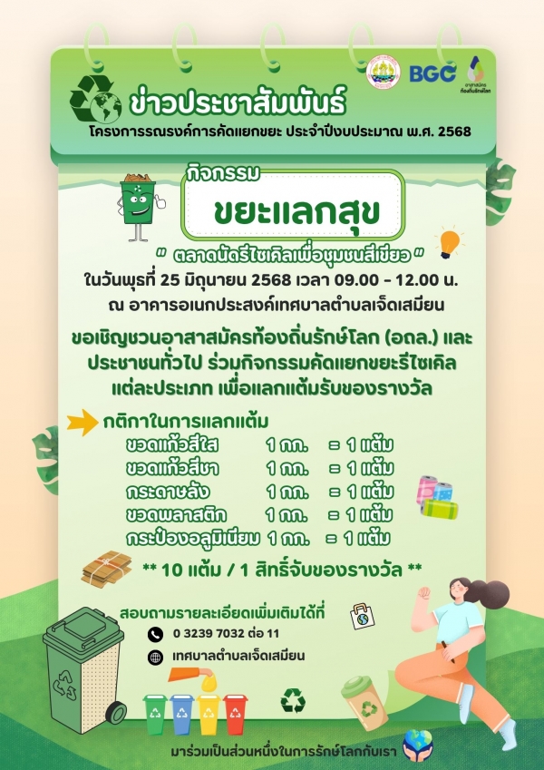 ประชาสัมพันธ์โครงการรณรงค์คัดเเยกขยะ ในวันพุธที่ 25 มิถุนายน 2568 เวลา 9.00 - 12.00 น. นำขยะมาเเลกเเต้มกันเยอะๆนะคะ