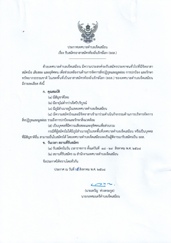 กองสาธารณสุขและสิ่งเเวดล้อมเทศบาลตำบลเจ็ดเสมียน ขอประชาสัมพันธ์ เรื่อง รับสมัครอาสาสมัครท้องถิ่น (อถล.) ประจำปีงบประมาณ 2568