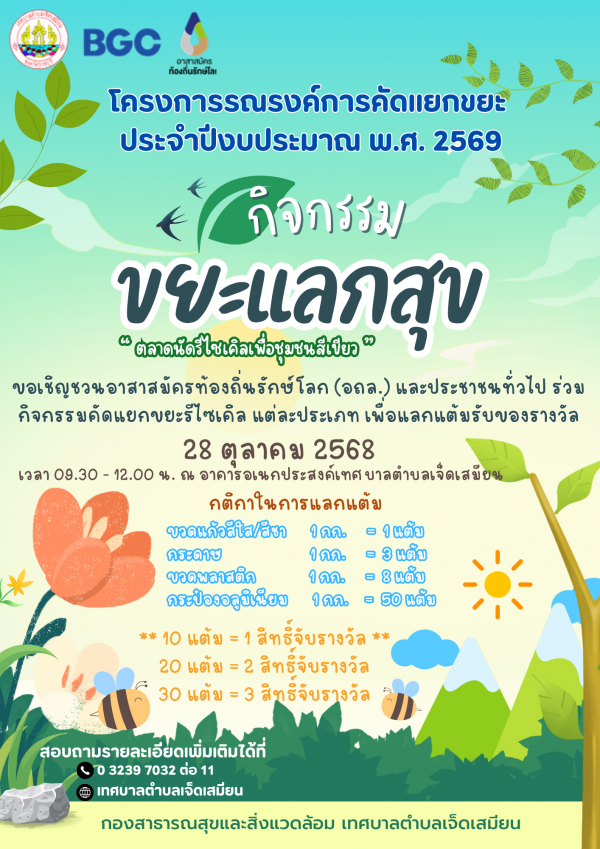 ขอเชิญชวนอาสาสมัครท้องถิ่นรักษ์โลก (อถล.) และประชาชนทั่วไป ร่วมกิจกรรมคัดแยกขยะรีไซเคิล แต่ละประเภท เพื่อแลกแต้มรับของรางวัล วันที่ 28 ตุลาคม 2568 เวลา 09.30 - 12.00 น. ณ อาคารอเนกประสงค์ เทศบาลตำบลเจ็ดเสมียน