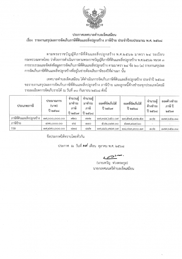 รายงานสรุปผลการจัดเก็บภาษีที่ดินและสิ่งปลูกสร้าง ภาษีป้าย ประจำปีงบประมาณ พ.ศ.2568